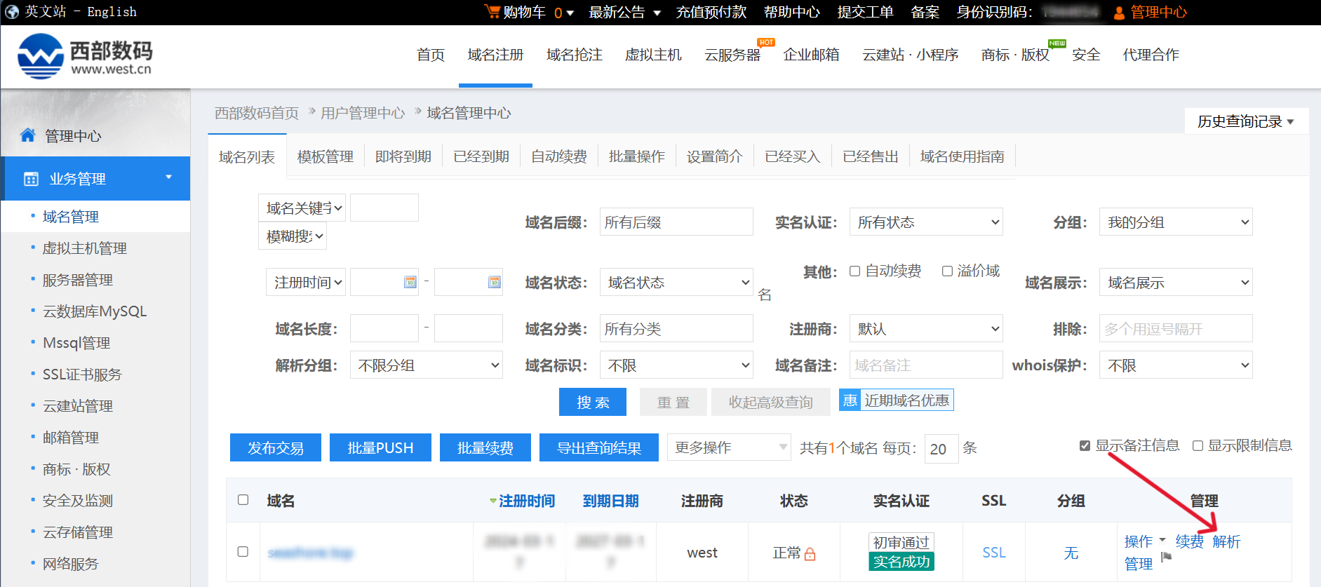 注册完成之后,就能在域名管理中看到自己注册的域名了